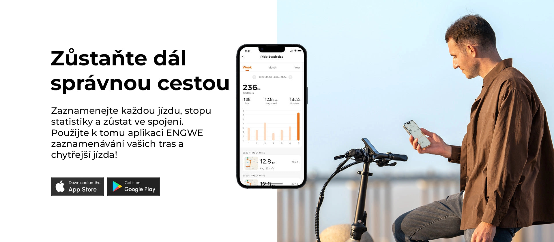 Plné odpružení a široké pneumatiky zajišťují pohodlnou jízdu i na nerovném povrchu, zatímco barevný displej zobrazuje všechny klíčové informace, jako je rychlost, stav baterie a zvolený jízdní režim.